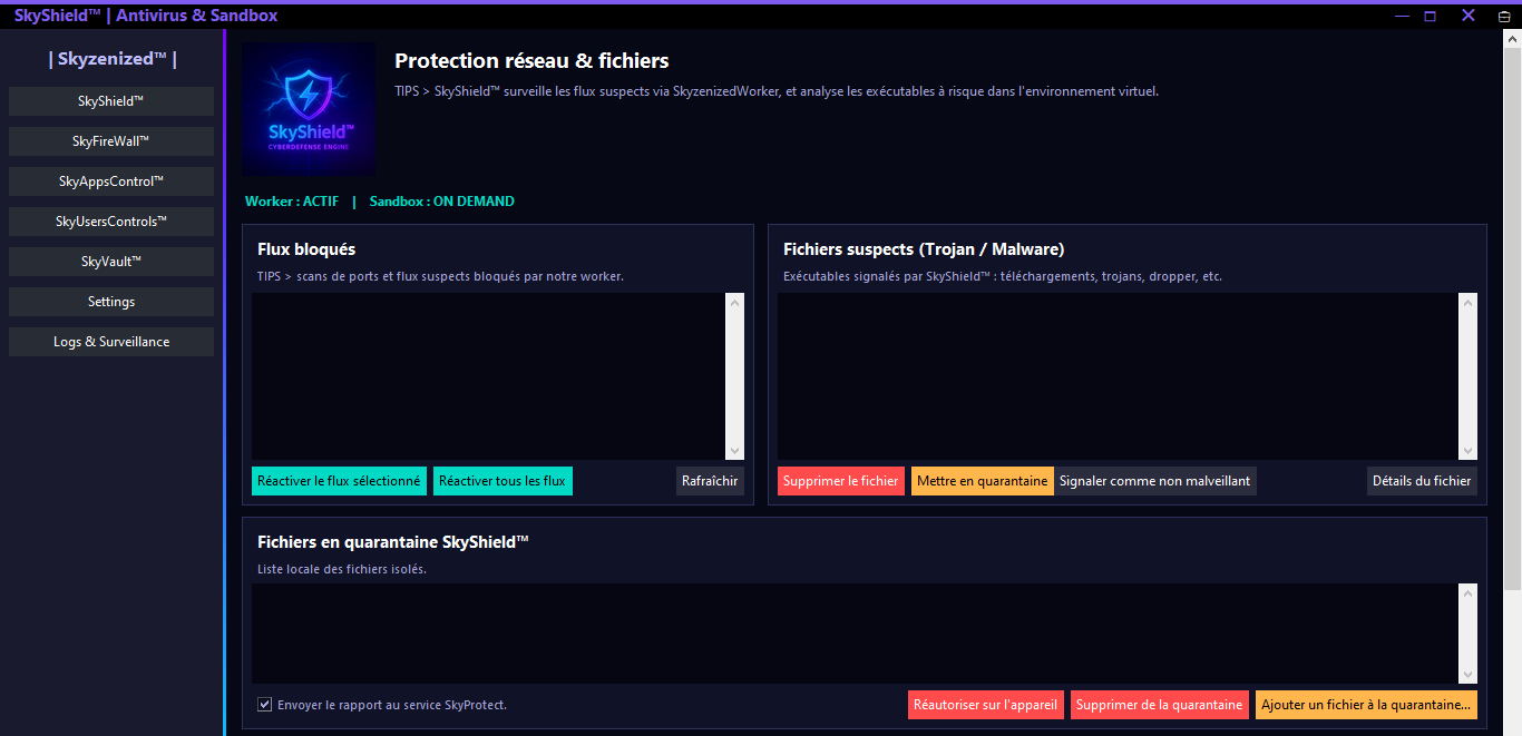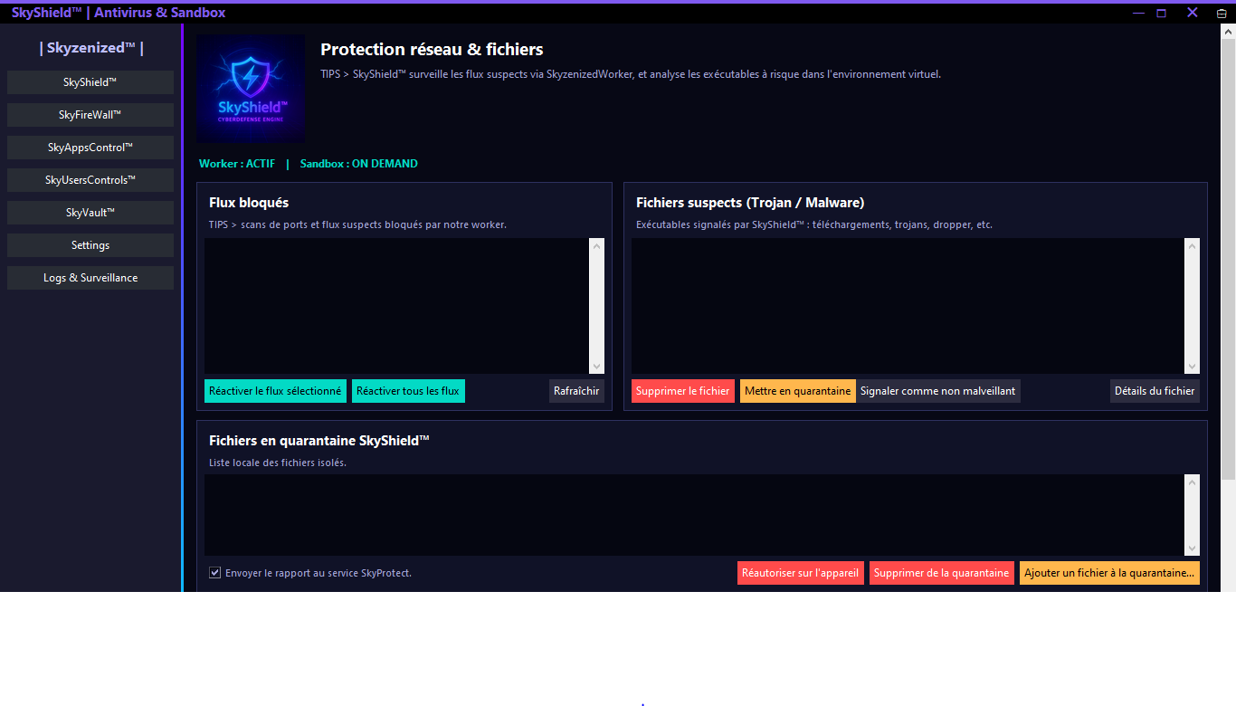 SkyWormGuard module: Anti-malwares & Anti-scripts avancé : détection comportementale, analyse des scripts suspects (BAT, PS1, JS…), neutralisation instantanée. module de SkyFireWall.